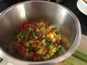 Tomaten, Lauchzwiebeln, Paprika , Gurke in Schüssel geben